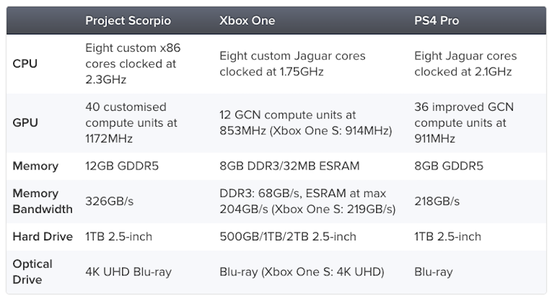 Over the past few months, there have been rumors of a new machine that is supposed to be the “next” big thing in gaming– that is supposedly going to compete with not just consoles but with the middle spec-ed members of the PC master race. It was called Project: Scorpio. A few days ago Microsoft released it’s specs. and since we are also interested in how it competes with the existing heavyweights we have a chart below courtesy of Digital Foundry.